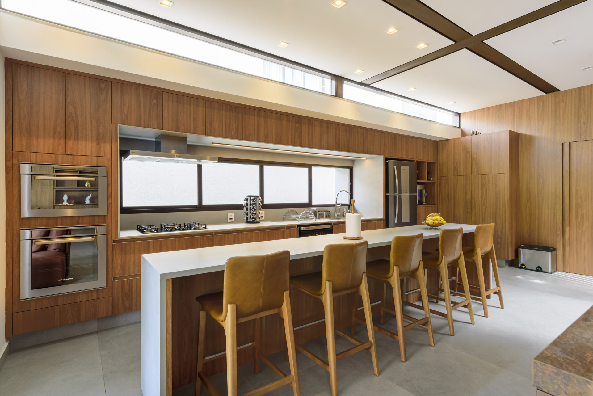 Cozinha gourmet que privilegia a convivência social. O design em madeira e o balcão minimalista conectam o interior ao paisagismo, oferecendo um ambiente modernoe extremamente versátil.