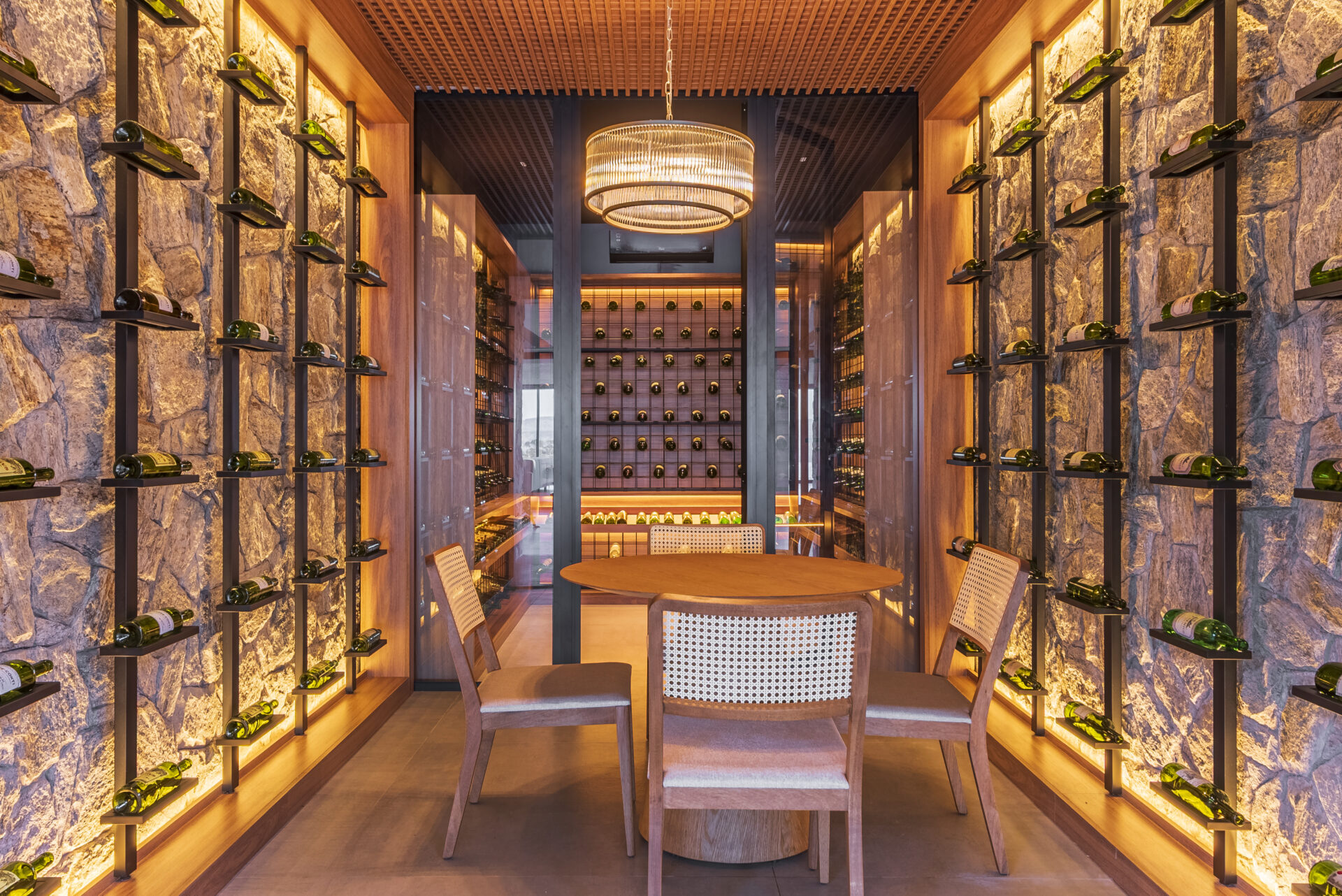 Um espaço exclusivo de degustação. A combinação da marcenaria sob medida com os revestimentos em pedra natural e a iluminação cênica cria uma adega compersonalidade e aconchego.