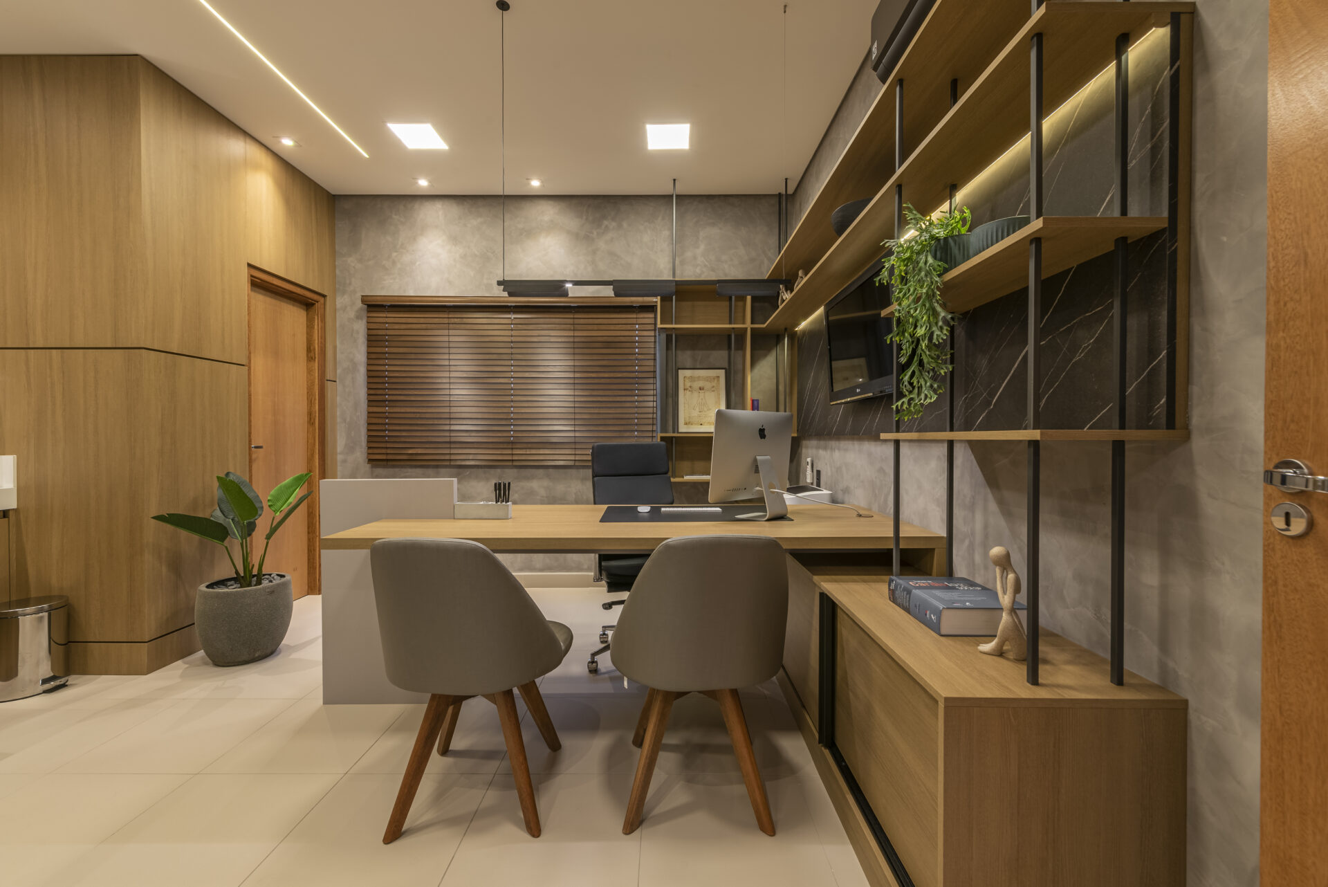 Funcionalidade executiva em um ambiente que inspira. A Todeschini projeta home offices com marcenaria planejada que alia o conforto visual da madeira à organização de alto nível.